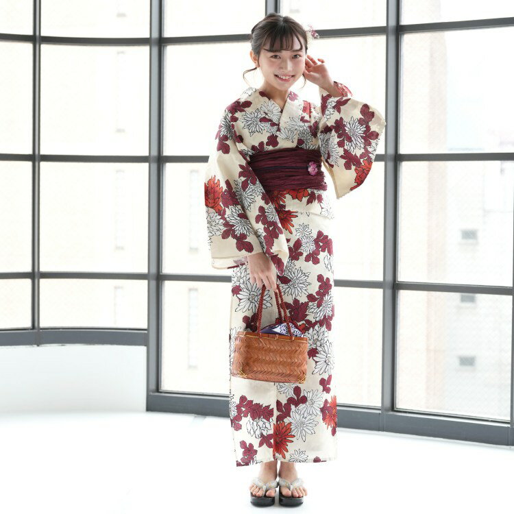 身丈 165cm 袖丈 約53cm 裄丈 約69cm 【適応身長】160cm〜165cm位裾周り約165cm ヒップ130cm位まで ゆかた : 綿100% 帯 : ポリエステル 下駄 : 桐(商品画像はイメージです。