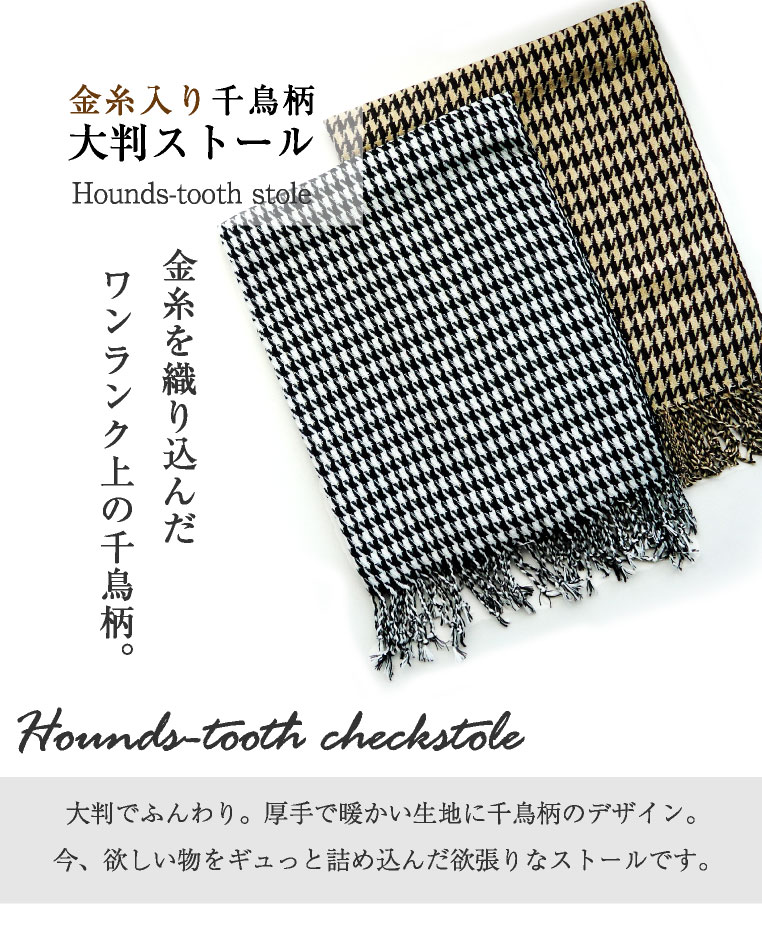 「金糸入り千鳥柄 大判ストール」 人気のポイント! ポイント,ワンランク上の千鳥柄 秋冬の定番、千鳥柄ストールに金糸を織り込み いつもの千鳥格子をレディに格上げ。