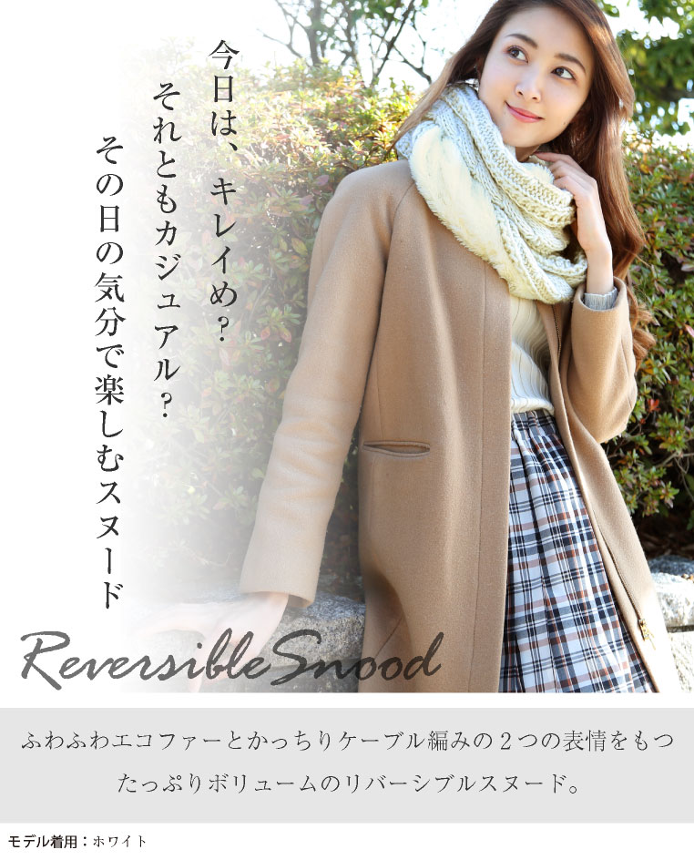 今日は、キレイめ?それともカジュアル? ふわふわエコファーとかっちりケーブル編みの2つの表情をもつ たっぷりボリュームのリバーシブルスヌード。