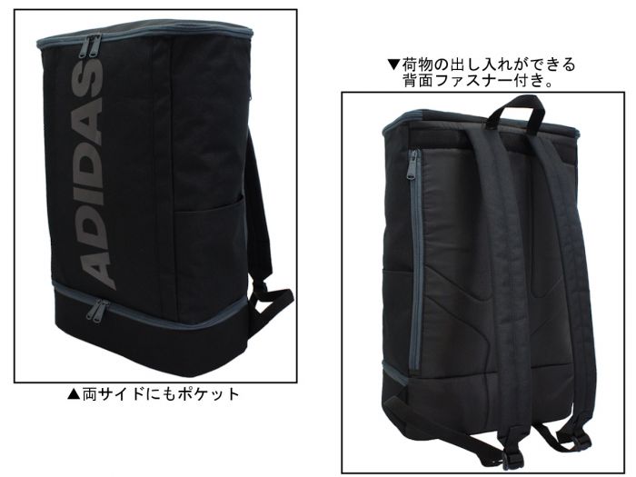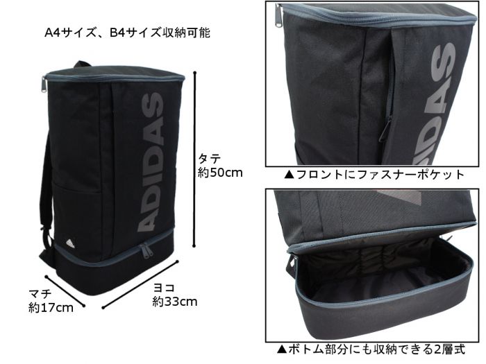 アディダス クラフト 二層式 スクエア デイパック BK/GY リュック 大容量 二層式 27L ブランド アディダスリュック adidas 55855 ロゴ 大文字 A4対応 B4対応 靴入れあり