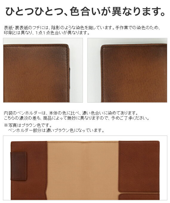 カラーバリエーション 商品名 【アントレ】ダイアリー&ノートカバー A5サイズ サイズ H225×W165×D15mm(厚さ10mmノート挿入時) 革(外装) ステア(牛革) 革(内装) ステア(牛革)/生地(レーヨン100%) 内装仕様(左) サイドポケット×1、カードスリット×1、ペンホルダー×1 内装仕様(右) アオリポケット×1 生産国 革:日本、縫製:中国 備考 ※メモ、ノートは付属しておりません。