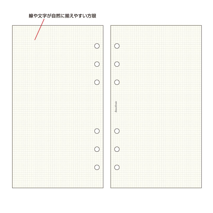 品番 522-514 サイズ ナロー(170mm×80mm) 素材 クリーム色のオリジナル手帳用紙 内容 図やグラフ、イラストなどの記入に便利な方眼2mmタイプ。