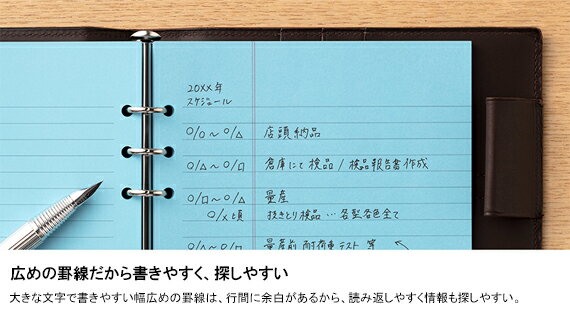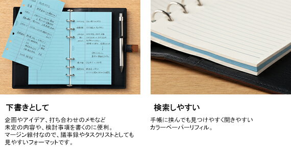 下書き用として手帳の中で上品に目立つブルー紙を採用した「リーガルパッド」は、考えをまとめたり、企画・アイデアを記録するのに便利なメモリフィルです。